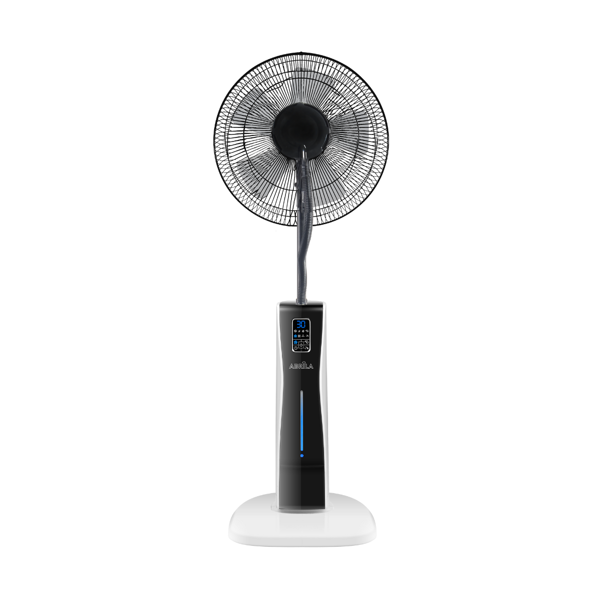 Ventilador de Pie de la serie CORVO con NEBULIZADOR Y TANQUE DE AGUA DE 2 LITROS, en color BLANCO/NEGRO con cinco aspas y tres velocidades. Gracias a su función nebulizadora, refresca y humifica rápidamente cualquier estancia, ideal para terrazas y patios, pulveriza micropartículas de agua con lo que aumenta la humedad y elimina el polvo. Realizado en metal y policarbonato. Motor AC. Tiene una potencia de 75 watios. Dos posiciones, fijo y rotatorio, también oscilante, pudiéndose redirigir el aire a la zona deseada y tres modos de aire NATURAL-SUEÑO-NORMAL. Presenta unas dimensiones de 125x43x40 centímetros. Manejo táctil con indicador LED, con mando a distancia INCLUIDO y TEMPORIZADOR de 1 a 12 horas, pudiendo seleccionar que el ventilador se apague solo automáticamente y consiguiendo un gran ahorro de energía. Viene con 4 ruedas invisibles para facilitar su traslado. El ventilador y el nebulizador pueden utilizarse por separados o juntos.