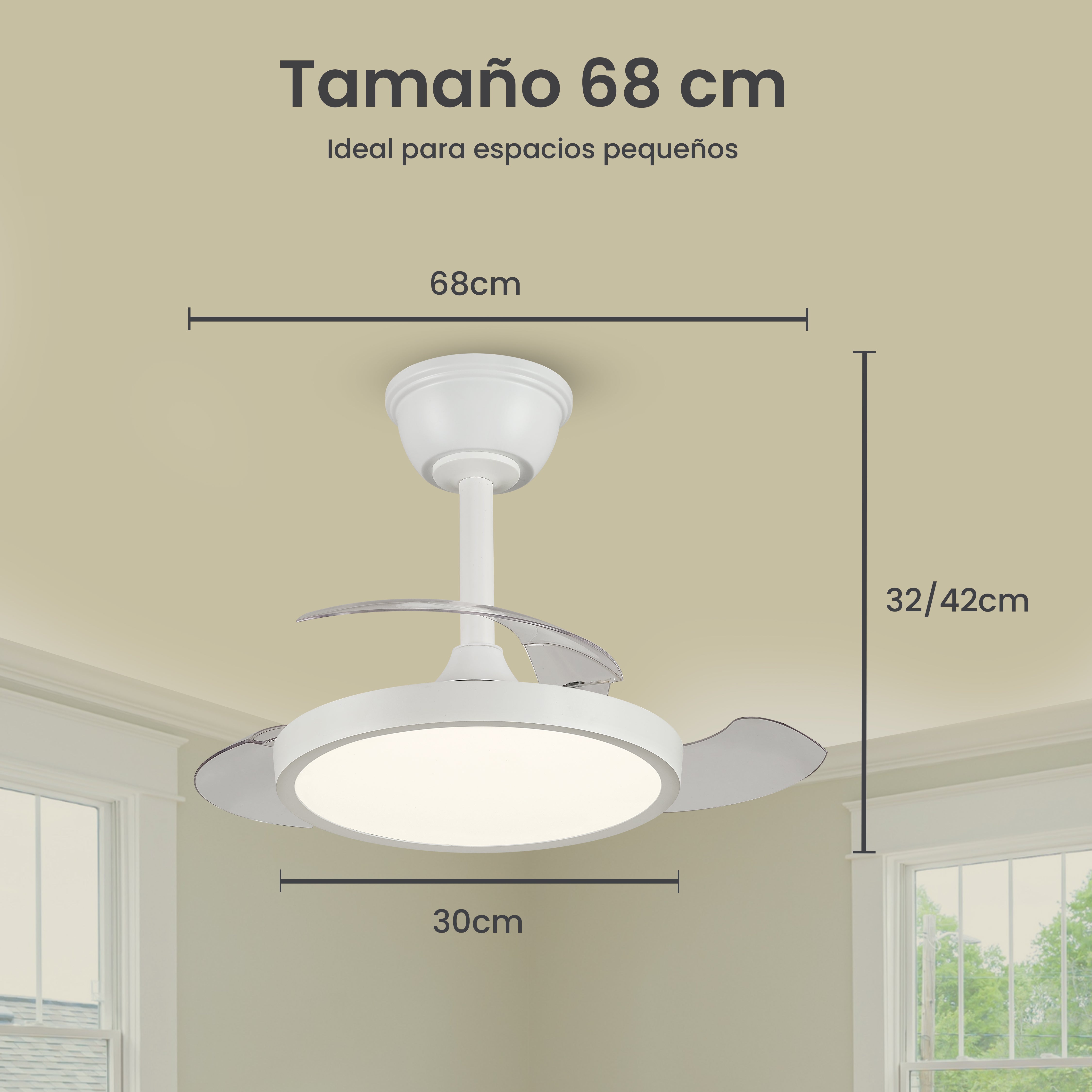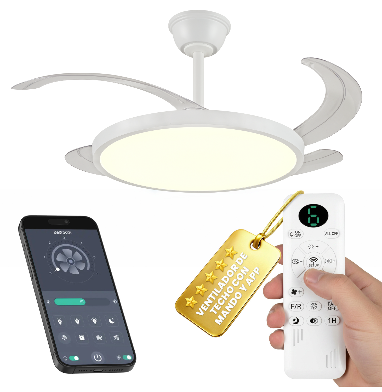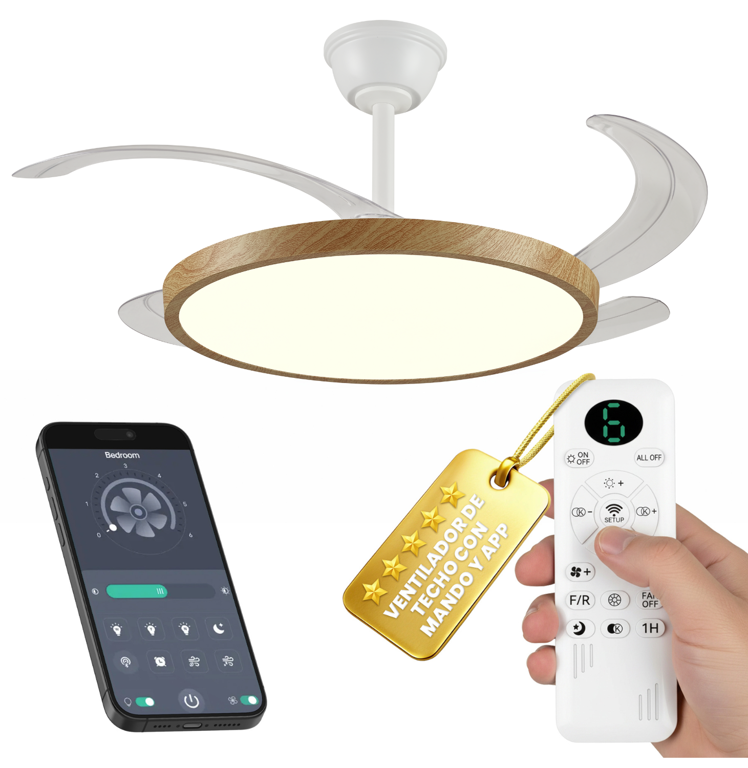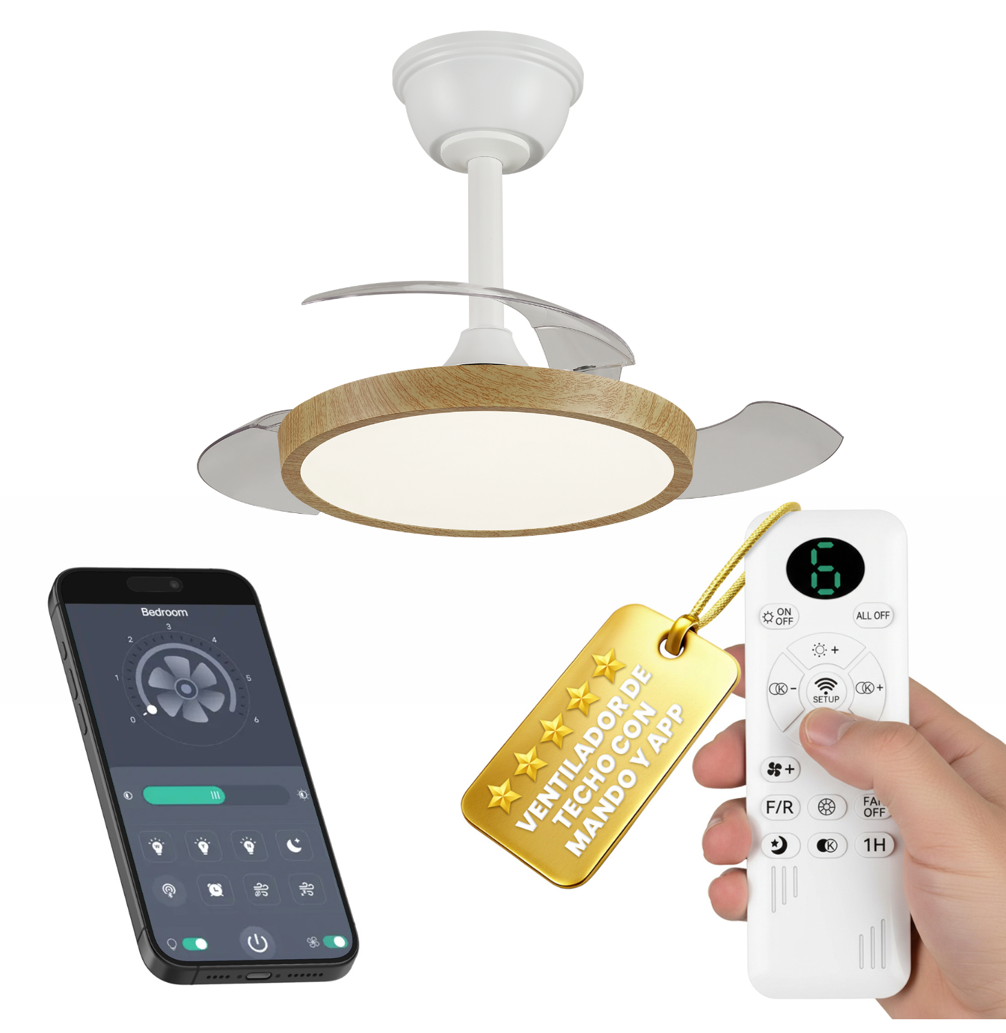 Mejora el confort de tu hogar con un ventilador de techo que combina ventilación eficiente, luz regulable y un diseño minimalista que se integra fácilmente en cualquier estancia. Disponible en color blanco o blanco con detalle efecto madera, aporta un estilo moderno, limpio y atemporal.
