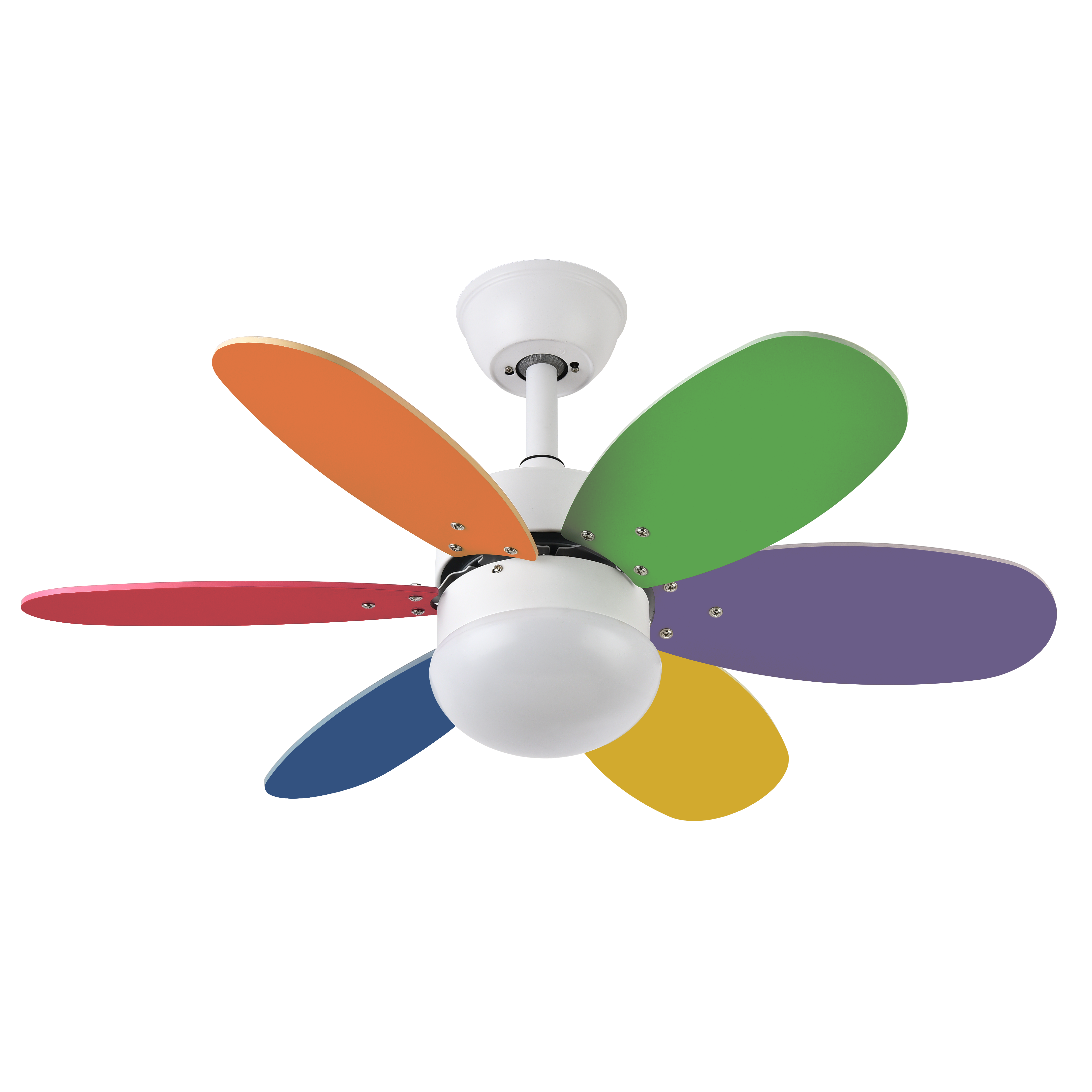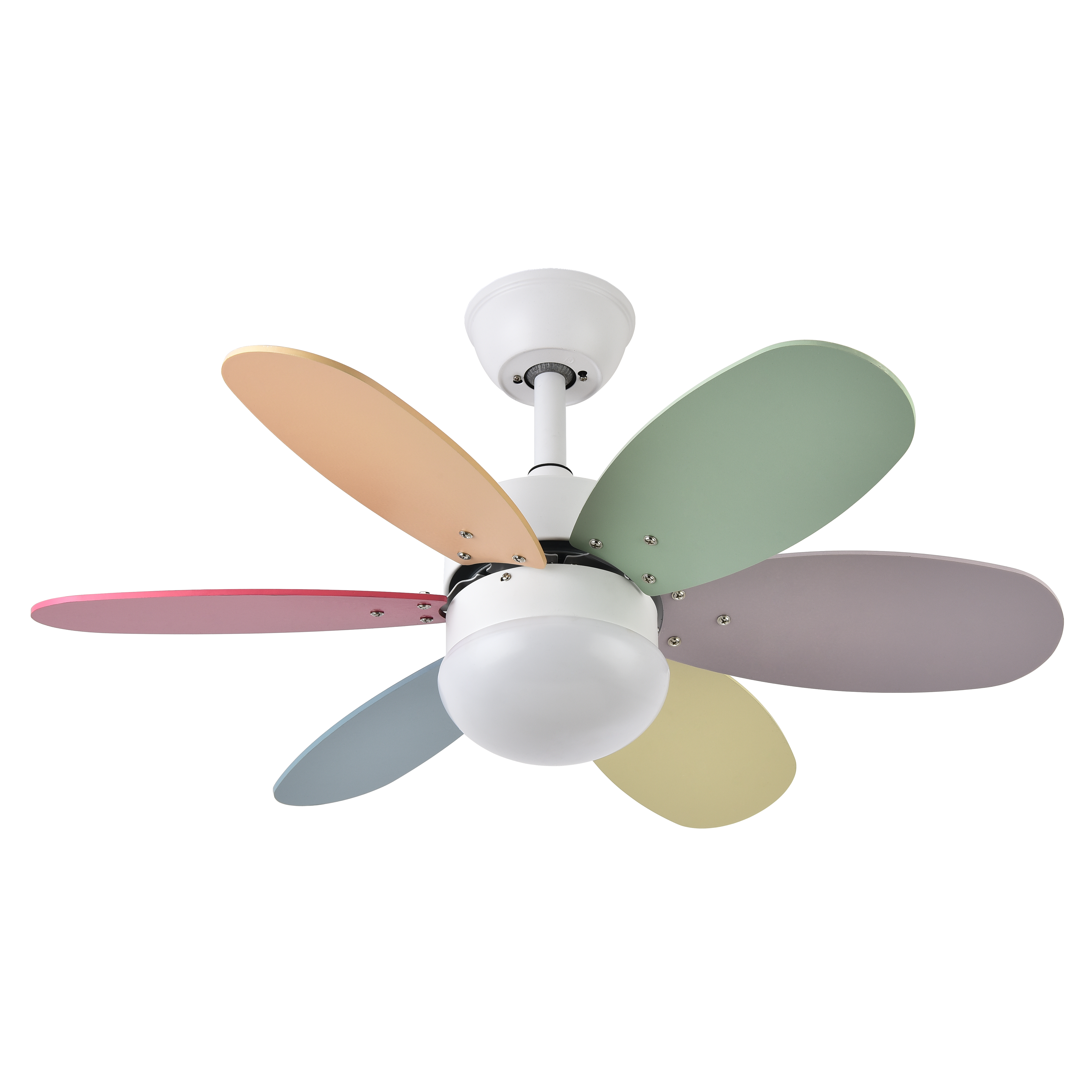 Ventilador DC serie ALVES de color BLANCO con cinco aspas REVERSIBLES en color PASTEL/INTENSO y seis velocidades. Sus dimensiones son 41x85x85 centímetros. Posee 2 portalámparas E27. Bombillas no incluidas. Tiene... Leer más...