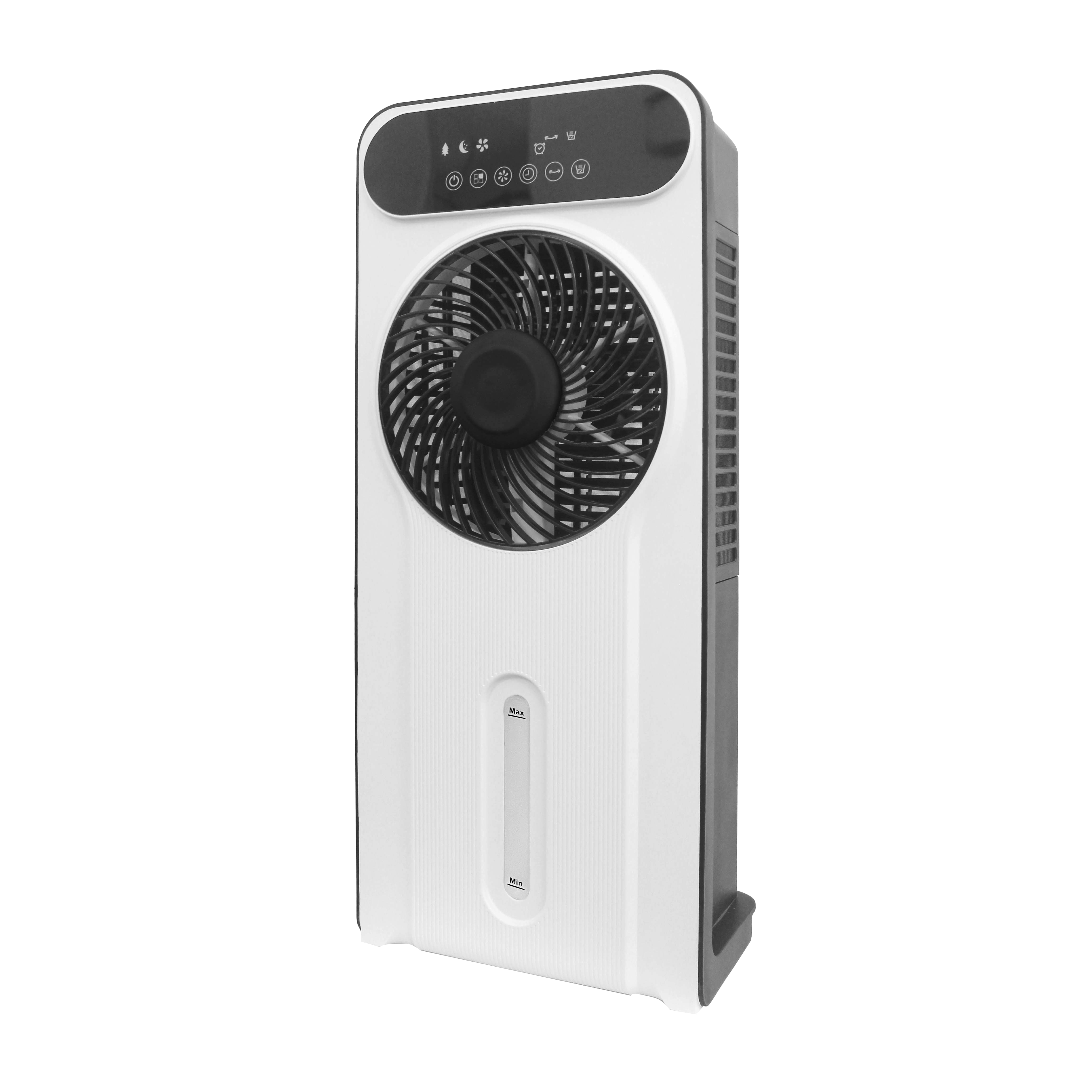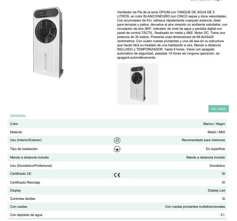 Ventilador de Pie de la serie OPIUM con TANQUE DE AGUA DE 5 LITROS, en color BLANCO/NEGRO con CINCO aspas y doce velocidades. Con acumulador de frío, refresca rápidamente cualquier estancia, ideal para terrazas y patios, devuelve al aire creando un ambiente saludable, con circulación de aire 360º, indicador de nivel de agua y pantalla digital con panel de control TÁCTIL. Realizado en metal y ABS. Motor DC. Tiene una potencia de 35 watios. Presenta unas dimensiones de 66,8x29x20 centímetros. Con cuatro ruedas pivotantes y una útil asa en su estructura que hacen fácil su traslado de una habitación a otra. Mando a distancia INCLUIDO y TEMPORIZADOR hasta 9 horas. Viene con apagado automático de seguridad, pasadas 10 horas sin ninguna operación, se apagará automáticamente.